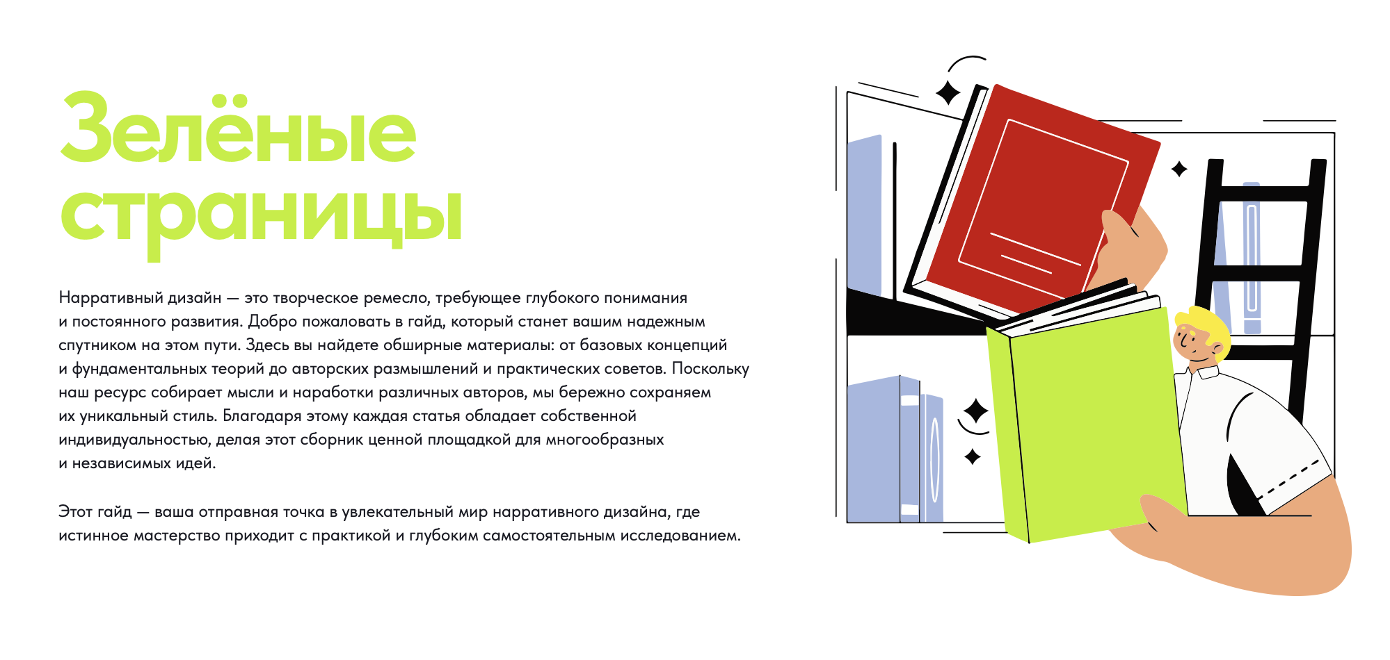 «Поскольку нарратив субъективен по природе своей, мы не боялись субъективности в составлении сборника. Авторы делятся именно своим видением и опытом, а мы, при некоторой редактуре, сохраняем авторский стиль. “Зелёные страницы” не опираются на иностранные учебники, потому что дублировать чужую понятийную базу, рожденную другим менталитетом, — это утопия. Разделы сборника высвечивают наиболее проблемные моменты в отечественной разработке. Например, что является базой профессии, какие вопросы возникают на этапе препродакшена или какие могут быть “подводные камни”. Особенный акцент я делаю на невербальных средствах выразительности, чтобы подчеркнуть, что нарратив — это не только слова. Обратите внимание и на раздел авторов, ведь над проектом потрудились уникальные специалисты как из видеоигровой индустрии, так и из смежных искусств», — прокомментировала Ася Чащинская, главный редактор «Зелёных страниц».
